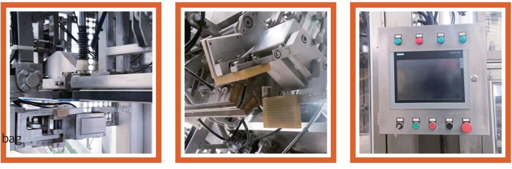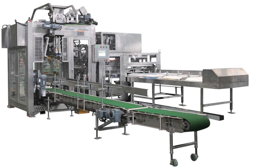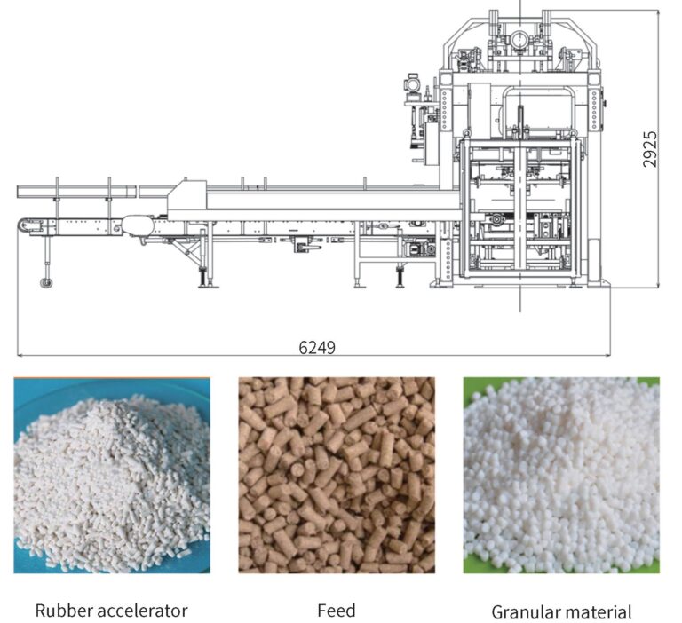 GXB-1000 ✔Power: 12KW✔Air consumption: 175Nm³/hour✔Packing weight: 20-50kg/bag✔Working capacity: 600-1200bag/hour✔Bag size: W (400-600) mm × H(700-1100)mm✔Bag material: Kraft, PE bag (T=0.18-0.25mm), Gusset bagWoven bag with film ✔Machine dimensions: 6250×4490×3000MM (include conveyor length)✔Multi-row design for bag magazine, 300 empty bag storage. Meet high capacity working condition.✔Chain mechanism seperate empty bag, greatly improve the reliavility of the bag supply.✔Servo motor control bag placer and bag holding, 2 independent swing arms complete the 2 actions, greatly improve packing speed.✔All joints installed high quality bearing extend ma-chine service life.