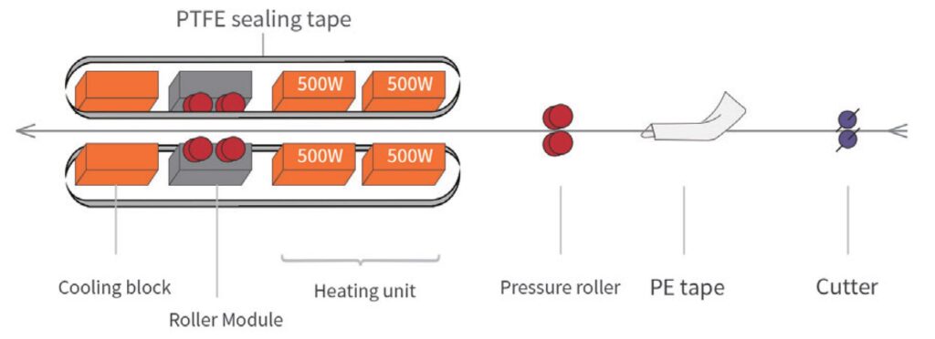 HS-22 Paper bag with PE lining Working process:Cutter:trim bag mouth →ON taps →Roller pressing →heating(2 sets heating block heating) → roller pressing→ plastic bag cooling(1 set cooling block)